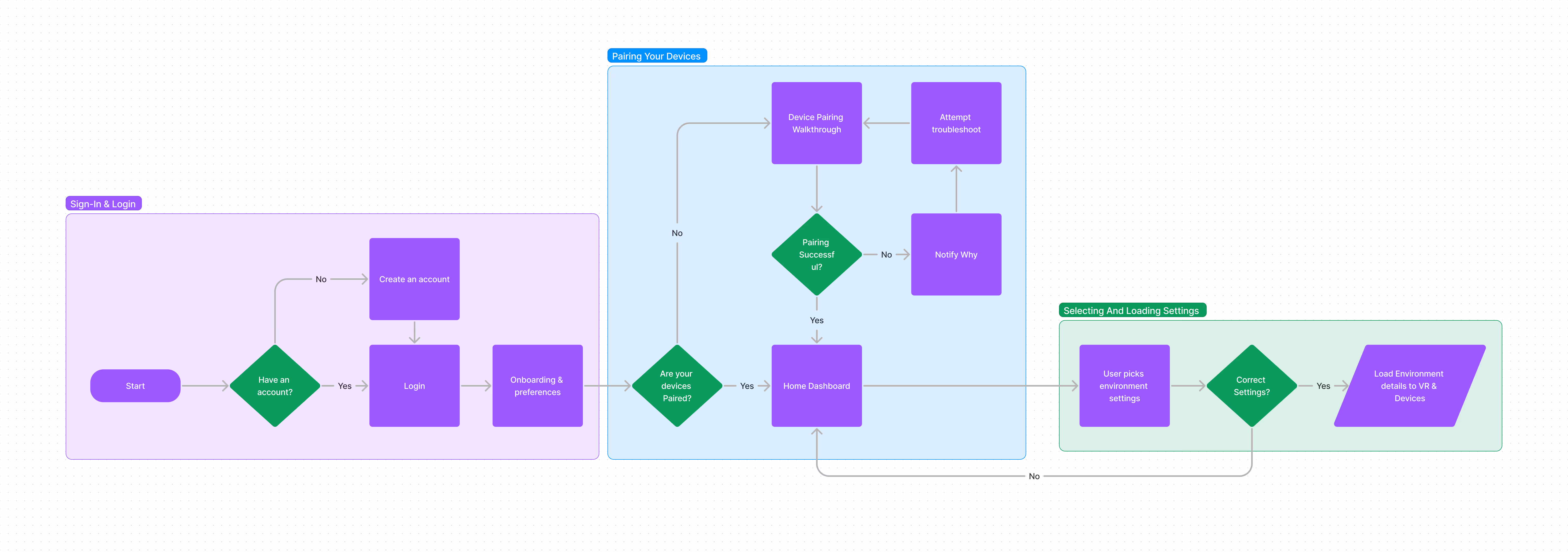 I developed a three-step user flow for onboarding, pairing devices, and publishing settings to the appropriate devices.